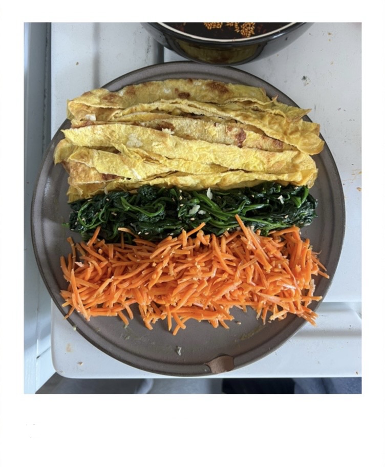 Place spinach, carrot, and egg strips in the center of the rice. Since we are skipping meat and pickled radish, these are your main fillings.
